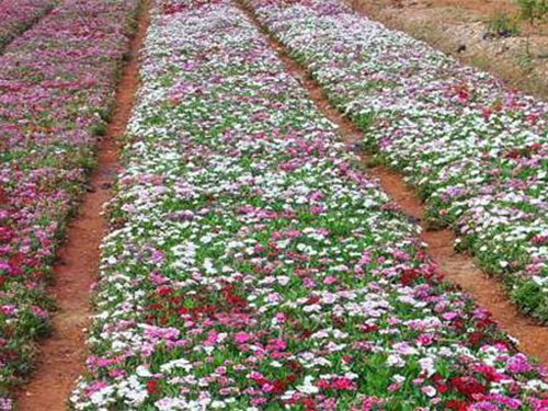 石竹株型低矮,莖稈似竹,葉叢青翠,自然花期5-9月,從暮春季節(jié)可開至仲秋,溫室盆栽可以花開四季。花頂生枝端,單生或成對,也有呈圓錐狀聚傘花序,花徑不大,僅2至3厘米,但花朵繁茂,此起彼伏,觀賞期較長。花色有白、粉、紅、粉紅、大紅、紫、淡紫、黃、藍(lán)等,五彩繽紛,變化萬端。園林中可用于花壇、花境、花臺或盆栽,也可用于巖石園和草坪邊緣點綴。大面積成片栽植時可作景觀地被材料,另外石竹有吸收二氧化硫和氯氣的本領(lǐng),凡有毒氣的地方可以多種。切花觀賞亦佳。